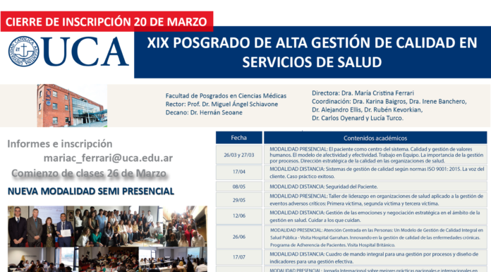 Les informamos que por las razones de público conocimiento, a partir del día de hoy y hasta el 6 de abril las clases presenciales estarán suspendidas en la Pontificia Universidad Católica Argentina, por lo que el primer módulo del POSGRADO DE ALTA GESTIÓN DE CALIDAD EN SERVICIOS DE SALUD (jueves 26 y viernes 27 de marzo) se desarrollará a distancia.
