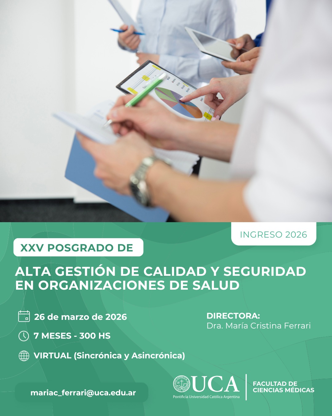 - Posgrado en Gestión de Calidad y Seguridad del Paciente: «Gestionar la innovación sostenible desde una mirada humana» dictado en la sede de UCA Rosario. Dirigido por la Dra. María Cristina Ferrari (Fundadora y Presidente de Fundación ICEM). Programa 2019