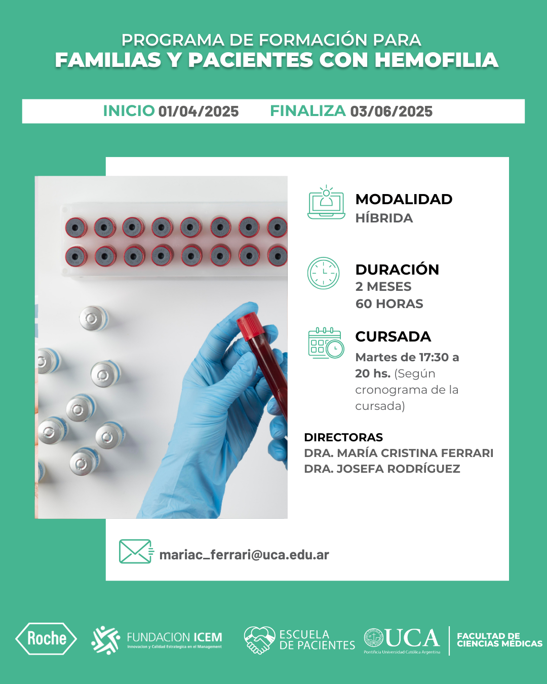 El programa de Formación para Familias y Pacientes con Hemofilia es un proyecto integral orientado a fomentar el Paciente activo, empoderado en su autocuidado y la gestión de la patología, con herramientas para influenciar de manera positiva en las políticas públicas con impacto para toda la comunidad de personas que viven con Hemofilia.