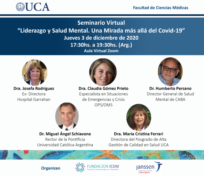 El día jueves 3 de diciembre, se realizó en la Facultad de Ciencias Médicas de la Pontificia Universidad Católica Argentina el Seminario: “Liderazgo y Salud mental. Una mirada más allá del COVID-19”, mediante un aula virtual, organizado por la Fundación ICEM con la colaboración del Laboratorio Janssen, donde tuvimos el honor de contar con la exposición de la Dra. Josefa Rodríguez (Ex Directora del Hospital Garrahan), la Lic. Claudia Gómez Prieto (Especialista en Situaciones de Emergencia y Crisis y Secretaría Académica de la Facultad de Psicología y Psicopedagogía de la UCA) y el Dr. Humberto Persano (Director General de Salud Mental del Gobierno de la Ciudad de Buenos Aires).
