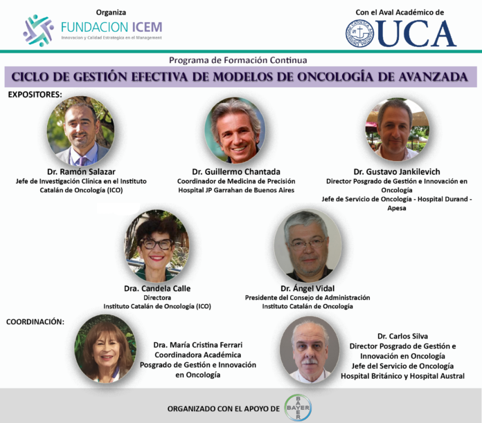 WEBINAR: CICLO DE GESTIÓN EFECTIVA DE MODELOS DE ONCOLOGÍA DE AVANZADA, es un ciclo de 2 charlas organizado por la Fundación ICEM junto a la colaboración del Laboratorio BAYER, en el marco del Programa de Capacitación Continua que realiza FICEM, para poder aportar experiencias y conocimientos adquiridos de profesionales referentes del ámbito de la salud, para profesionales Latinoamérica, mediante la herramienta ZOOM.