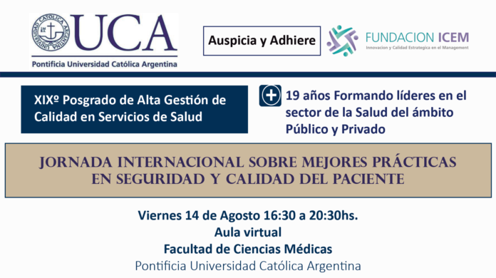 Como todos los años, los invitamos a participar en la JORNADA INTERNACIONAL VIRTUAL SOBRE MEJORES PRÁCTICAS EN SEGURIDAD Y CALIDAD DEL PACIENTE que se realizará en el marco del XIX Posgrado de Alta Gestión de Calidad en Servicios de Salud y del II Posgrado Internacional en Gestión de Riesgos en Salud y Seguridad del Paciente, de la Facultad de Ciencias Médicas, de la Pontificia Universidad Católica Argentina.