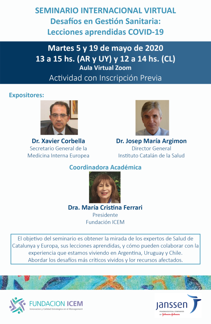 El martes 19 de mayo, se realizó el último encuentro del SEMINARIO INTERNACIONAL VIRTUAL – DESAFÍOS EN GESTIÓN SANITARIA: LECCIONES APRENDIDAS COVID-19, organizado por la Fundación ICEM con la colaboración del Laboratorio Janssen, donde diferentes profesionales de la salud de Argentina, Uruguay y Chile, pudieron escuchar la experiencia de los profesionales de Catalunya y Europa, el Dr. Josep María Argimon (Director del Instituto Catalán de la Salud) y del Dr. Xavier Corbella (Secretario General de la Medicina Interna Europea), responder algunos interrogantes y debatir sobre la pandemia COVID-19, situación sanitaria que afecta a todo el mundo.