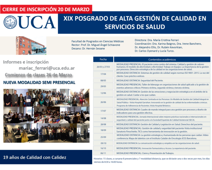 CIERRE DE INSCRIPCIÓN 20 DE MARZO – POSGRADO DE ALTA GESTION DE CALIDAD EN SERVICIOS DE SALUD – UCA
