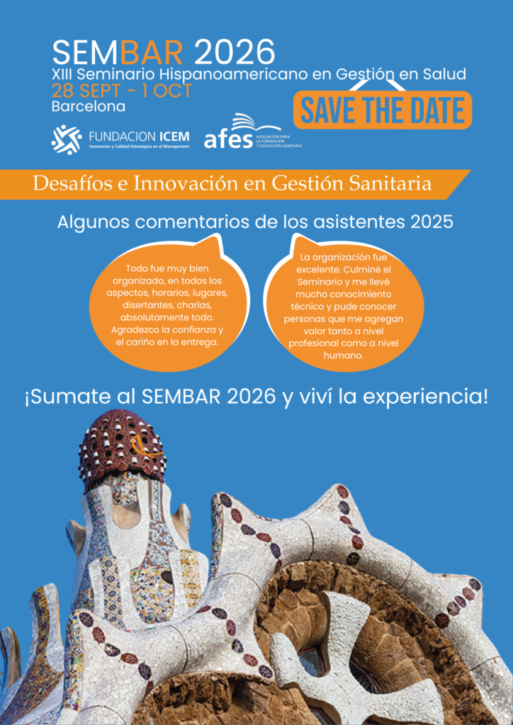 Inicio Actividades Académicas Save the date – SEMBAR 2026 en Barcelona Actividades AcadémicasDestacadas Save the date – SEMBAR 2026 en Barcelona Por Jimena Aguilar - 9 diciembre, 2025 153 Compartir en Facebook Compartir en Twitter Informes e Inscripción: coordinacion@ficem.org.ar Artículo relacionadosMás del autor Actividades Académicas El Foro Español de Pacientes y Fundación ICEM firman un Convenio de Colaboración para Fortalecer la Voz Ciudadana en Salud en Latinoamérica Actividades Académicas XXV Posgrado de Alta Gestión de Calidad y Seguridad en organizaciones de Salud. Actividades Académicas Encuentro del Comité de Expertos – Rumbo a la 2da Edición Premio Afectivo-Efectivo ACTIVIDADES Actividades Jimena Aguilar - 20 mayo, 2025 I Foro Entrega de Premios Afectivo-Efectivo Actividades Jimena Aguilar - 19 mayo, 2025